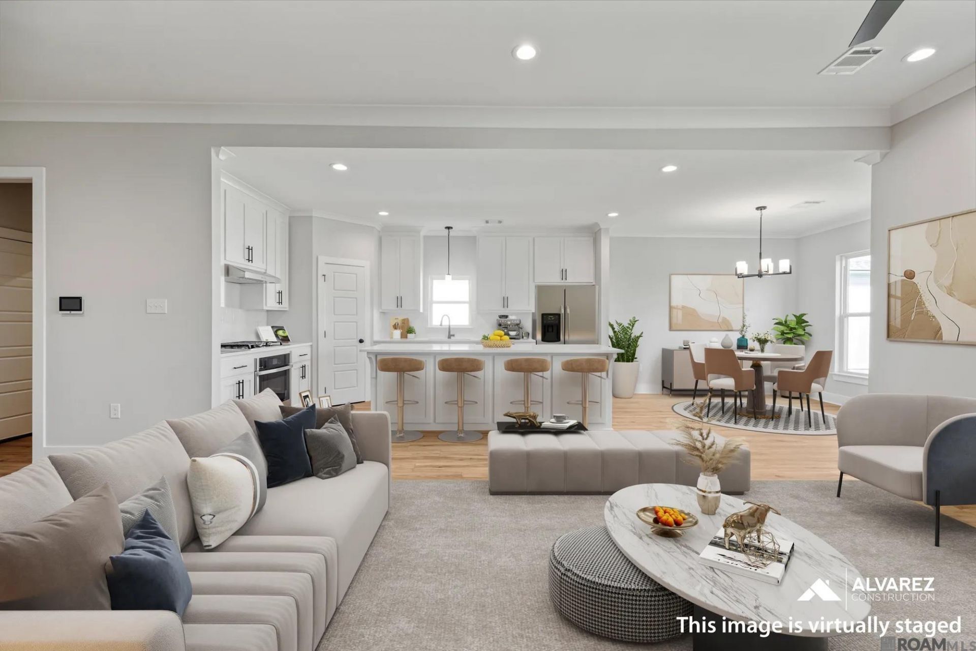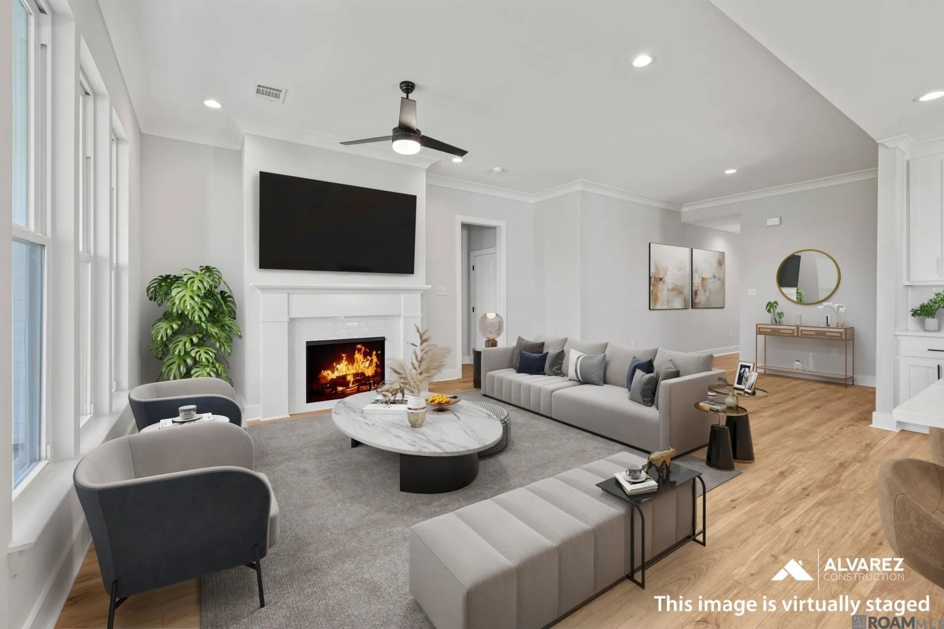 4.99% (5.73%) interest rate on GOV loans + closing cost assistance available! Estimated completion: complete and ready to move in *TO BE ELIGIBLE FOR A LOW INTEREST RATE ON GOV LOANS & CLOSING COST ASSISTANCE, A BUYER MUST USE SELLER'S PREFERRED MORTGAGE & TITLE COMPANY. NOT AVAILABLE ON ALL HOMES. OTHER RESTRICTIONS APPLY. CONTACT COMMUNITY SALES MANAGER FOR DETAILS.* Discover the Belfast, a single-story home by Alvarez Construction offering 3 bedrooms, 2 baths, and 1,789 sq ft of well-designed living space. The open-concept layout with 10-foot ceilings connects the kitchen, dining, and living areas for easy everyday living and entertaining. The kitchen features a large chef's island and breakfast nook. The private owner's suite includes dual vanities, walk-in shower, garden tub, water closet, and walk-in closet. Two additional bedrooms share a full bath, with a utility room off the 2-car garage. Level 2 Luxury Vinyl Plank in all living areas and owners bedroom and closet Upgraded tile to a level 3 in all bathrooms and the utility room Upgraded the fireplace surrounding tile to a level 2 Upgraded to quartz countertops throughout the home Upgraded to a gourmet kitchen which will feature a metal vent hood and microwave relocation to the kitchen island Upgraded the kitchen backsplash tile to a level 2 Added kitchen cabinets to the ceiling Added a trashcan pull out Fixtures are going to be matte black Upgraded lighting to our level 3 matte black dart collection Upgraded the owners shower to a tiled shower Upgraded to have wood framed mirrors in the bathrooms